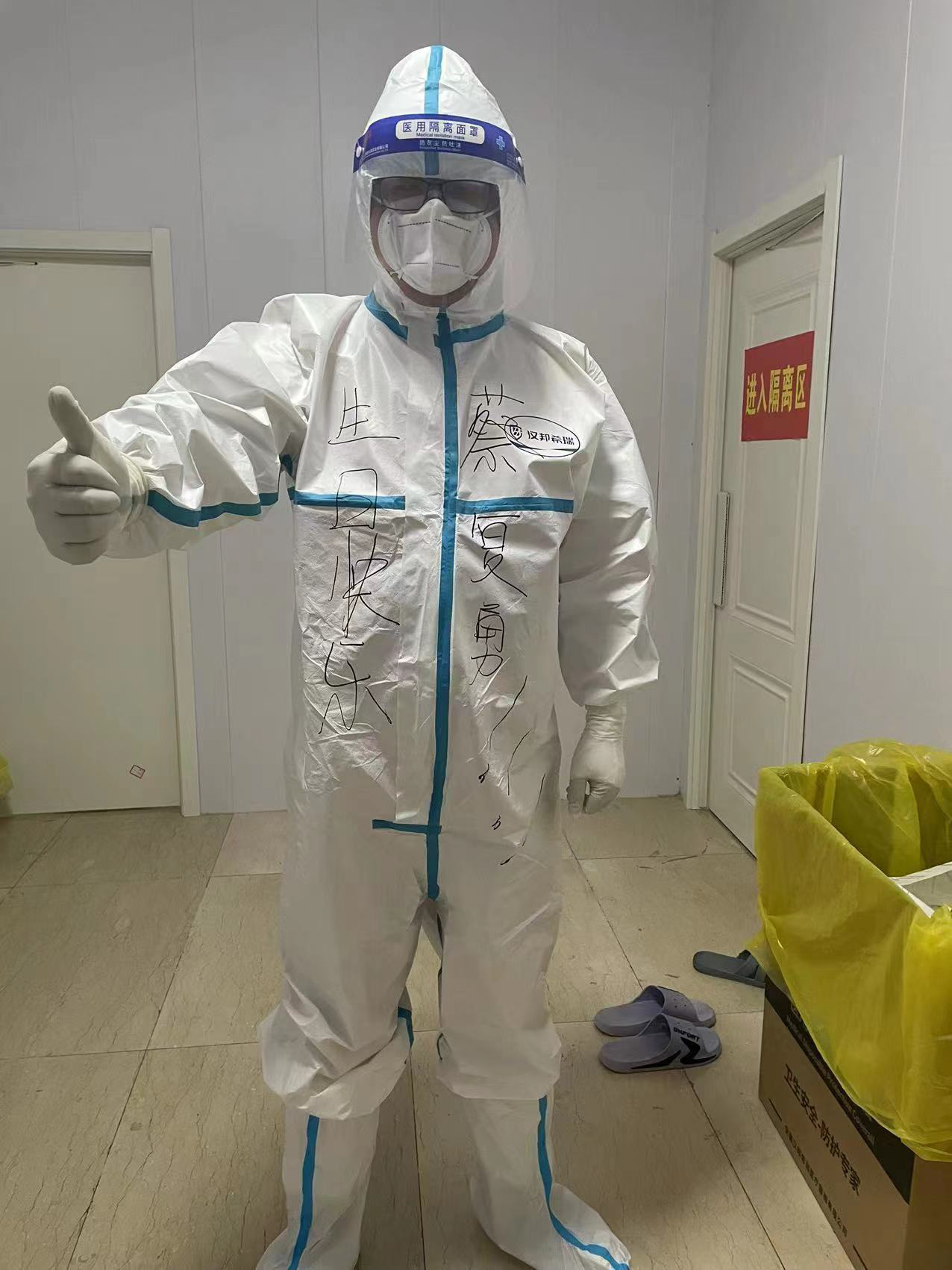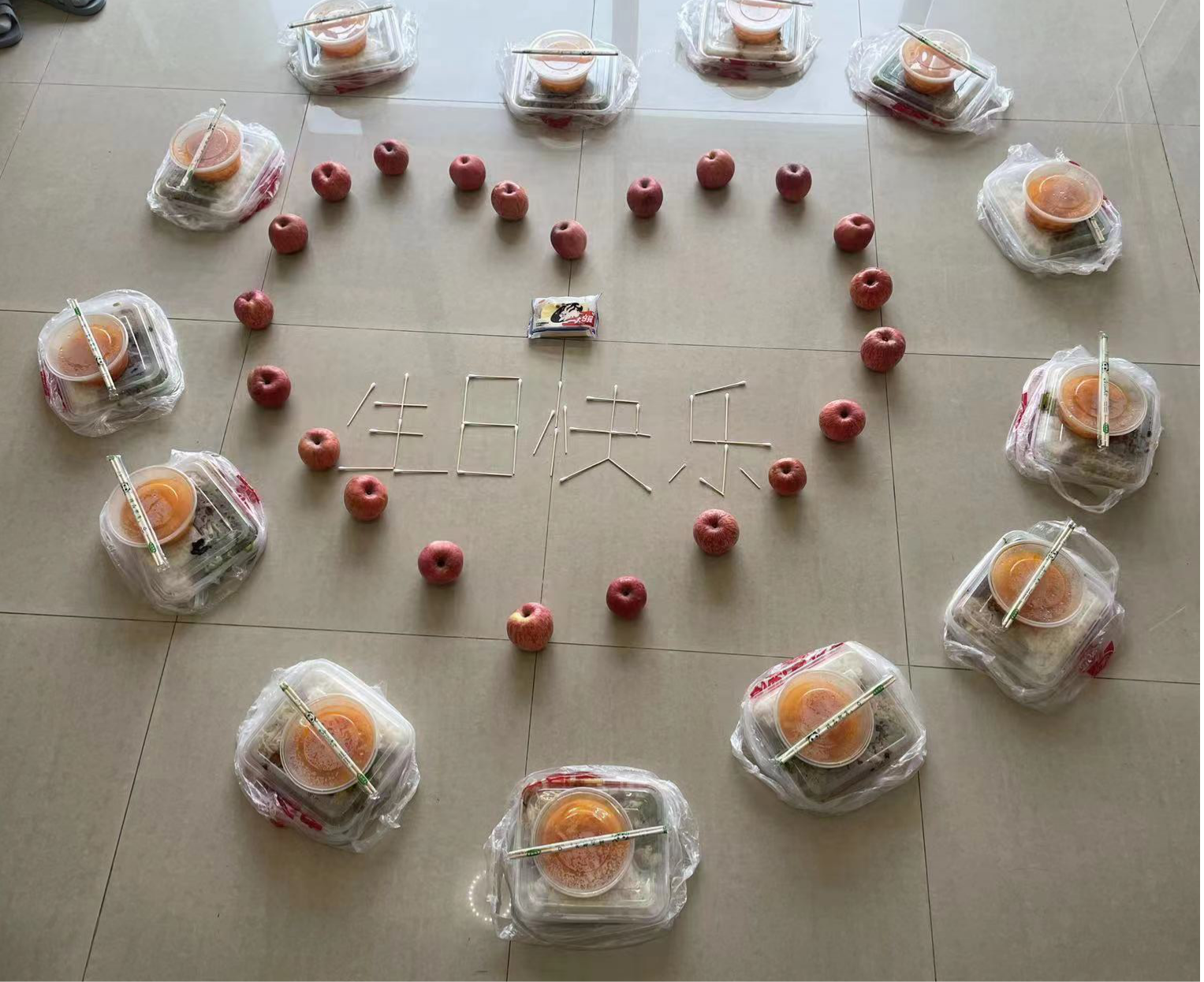一大早,謝李大井隔離點(diǎn)負(fù)責(zé)人、市紀(jì)委監(jiān)委駐市住建局紀(jì)檢組組長(zhǎng)施德福就給蔡復(fù)勇發(fā)送了生日祝福短信。出勤時(shí),同事們?cè)诓虖?fù)勇防護(hù)服前后寫上大大的“生日快樂(lè)”,不管認(rèn)識(shí)或不認(rèn)識(shí)的隊(duì)友都紛紛獻(xiàn)上祝福。中午,同事們因陋就簡(jiǎn),用棉簽擺出“生日快樂(lè)”字樣,并用蘋果和盒飯擺出“愛(ài)心”緊緊圍住。領(lǐng)導(dǎo)的關(guān)心,隊(duì)友的關(guān)愛(ài)、濃濃的祝福、溫馨的場(chǎng)景,蔡復(fù)勇深深地感受到了大家庭的溫暖。